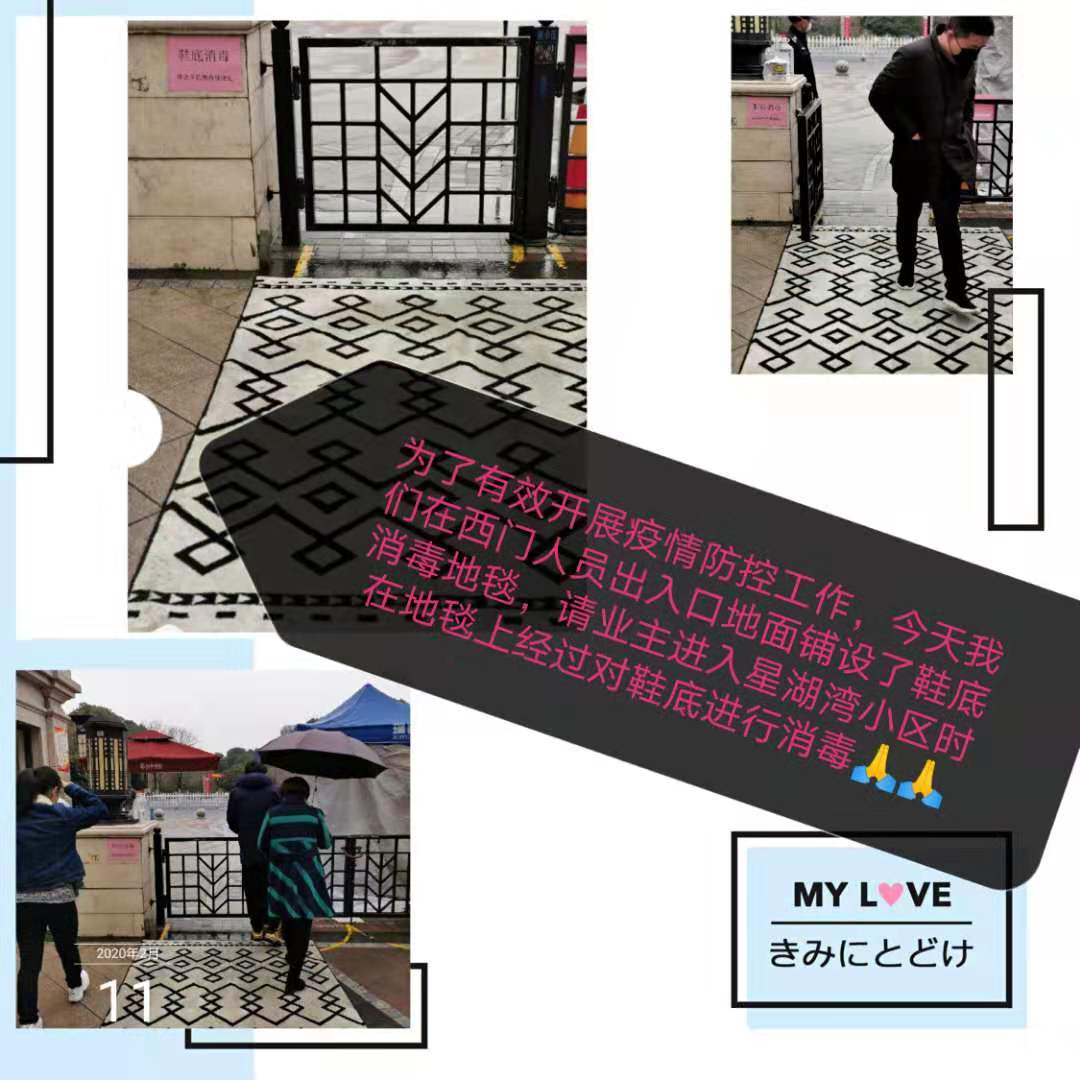 2月11日,瑞源物业各项目陆续落实在园区进出的唯一通道上铺设消毒地毯,并张贴温馨提示,让每一位进出小区的业主从上面通过,在踩踏过程中可以简单有效的消除鞋底所携带的病菌。