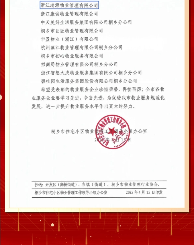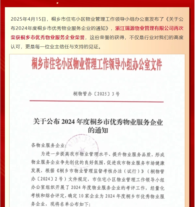 喜报丨瑞源物业荣获“2024年度桐乡市优秀物业服务企业”荣誉
