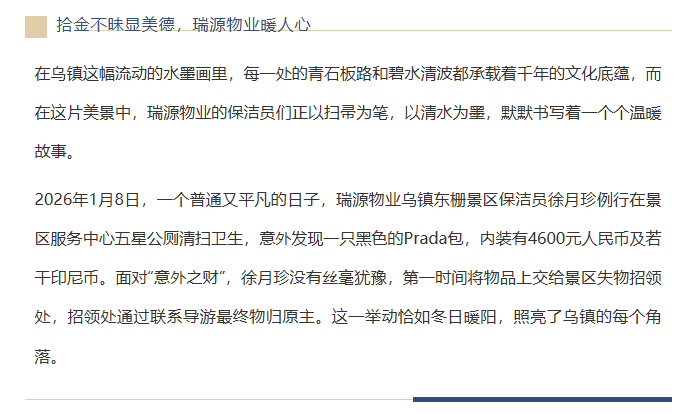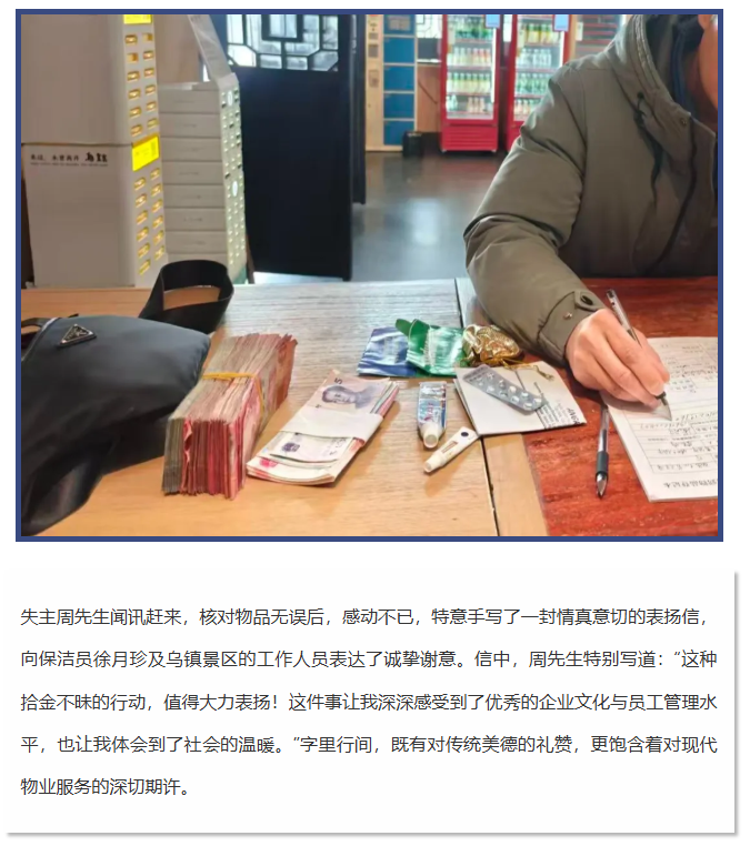 乌镇景区暖冬里的“诚信之光”:保洁员拾金不昧显美德,精细化管理铸口碑