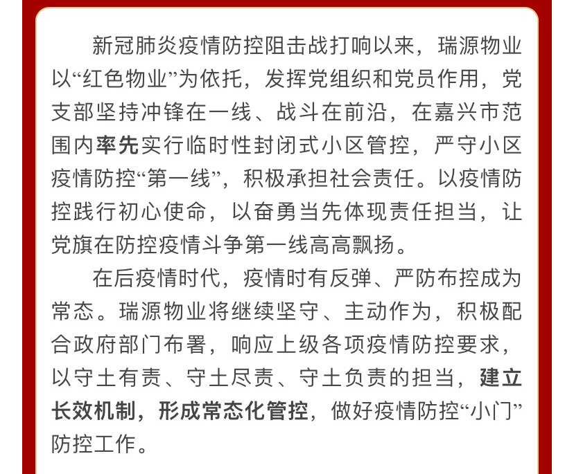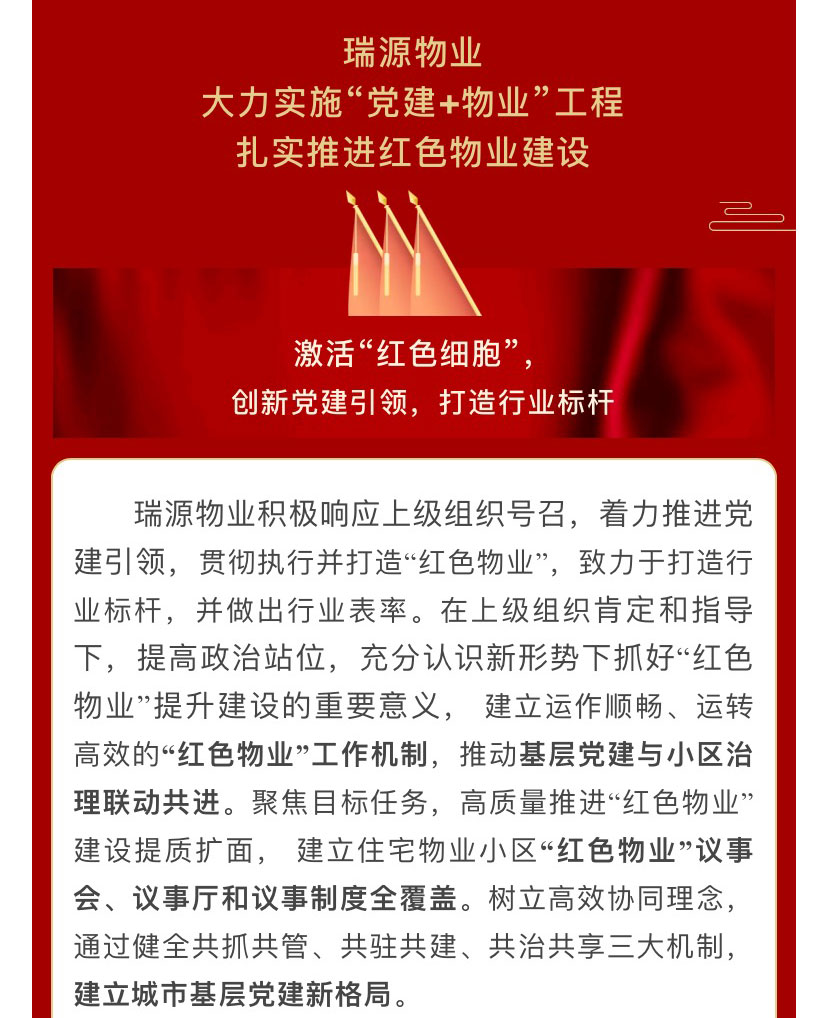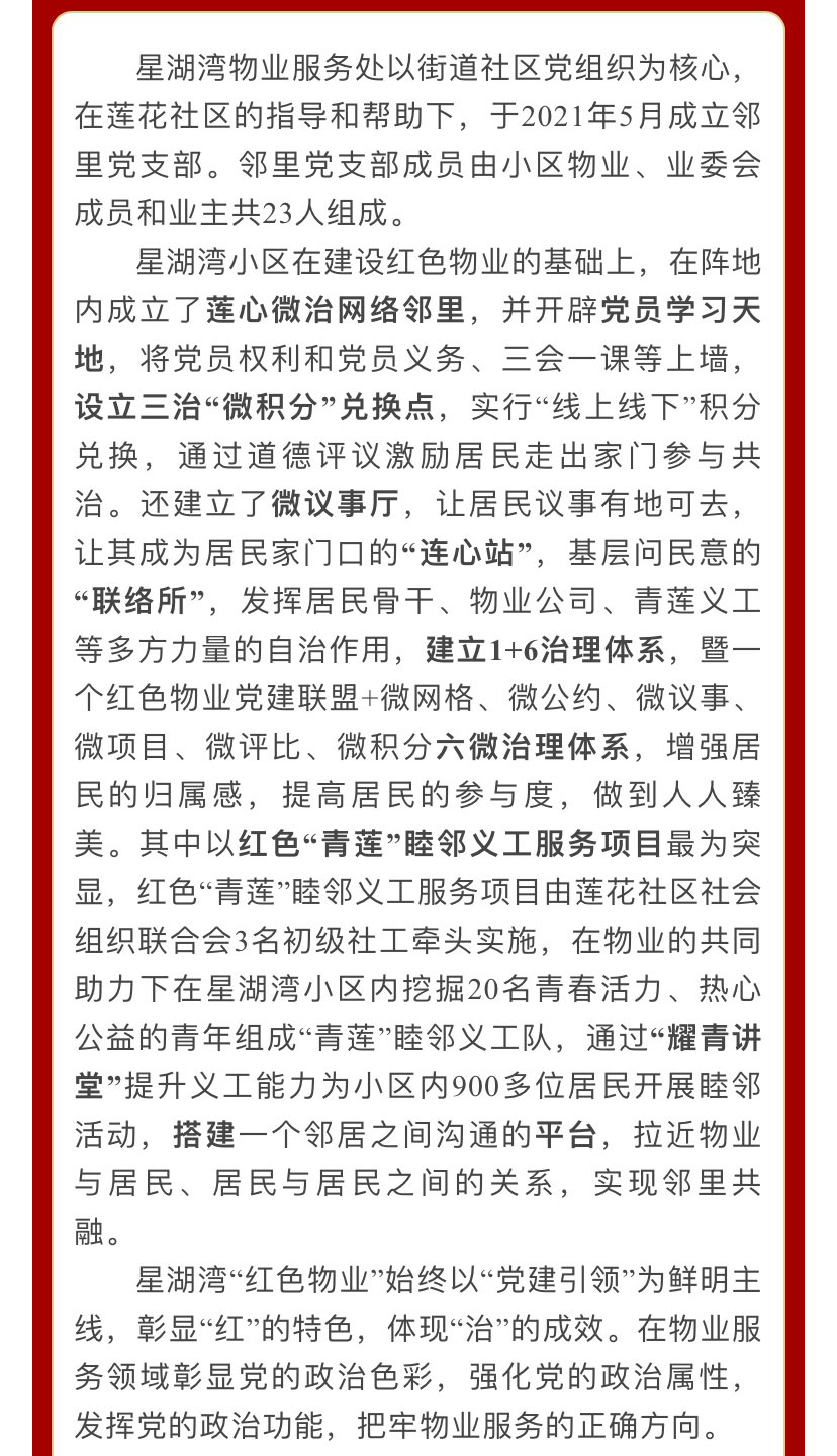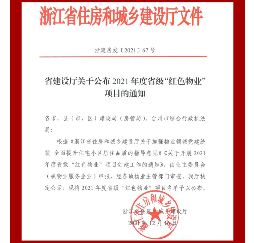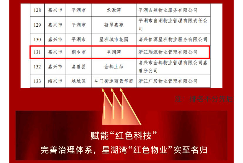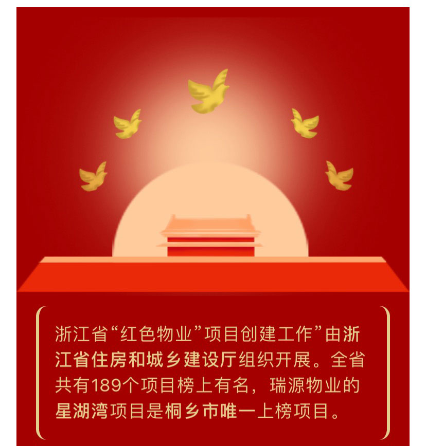 浙江省“红色物业”项目创建工作”由浙江省住房和城乡建设厅组织开展。全省共有189个项目榜上有名,瑞源物业的星湖湾项目是桐乡市唯一上榜项目。